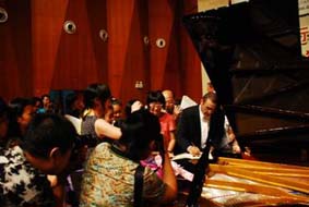 此次參加音樂(lè)會(huì)的觀眾大多是學(xué)生家長(zhǎng)及學(xué)琴小朋友,由于有些小朋友年紀(jì)還很小,工作人員開(kāi)始還有擔(dān)心現(xiàn)場(chǎng)秩序,但是當(dāng)鋼琴家亞歷山大·帕雷演奏開(kāi)始,現(xiàn)場(chǎng)便寂靜無(wú)聲,這讓亞歷山大·帕雷非常驚訝,直到上半場(chǎng)他與夫人陳佩雯女士四手聯(lián)彈結(jié)束之際,現(xiàn)場(chǎng)爆出經(jīng)久不息的掌聲一直持續(xù)到主持人宣布中場(chǎng)休息。下半場(chǎng)雖然曲目演奏時(shí)間較長(zhǎng),但是一直到演出結(jié)束之前,場(chǎng)內(nèi)一直都保持著安靜,直到演奏結(jié)束,現(xiàn)聲才爆發(fā)出雷鳴般且經(jīng)久不息的掌聲。鄭州小琴童位都爭(zhēng)先恐后的涌上舞臺(tái)與這位帶給他們神奇視聽(tīng)的大師合影留念。其中有一位小朋友讓亞歷山大·帕雷夫婦非常欣賞,還特別在現(xiàn)場(chǎng)進(jìn)行了一番指導(dǎo),這讓其家長(zhǎng)及老師欣喜不已,但由于時(shí)間有限,亞歷山大·帕雷在工作人員的陪同下迅速消失在人群中,鄭州觀眾的熱情讓鋼琴家欣喜不已.帶著這種心情,我們很快便踏上了去往最后一站南京的旅途中。。。