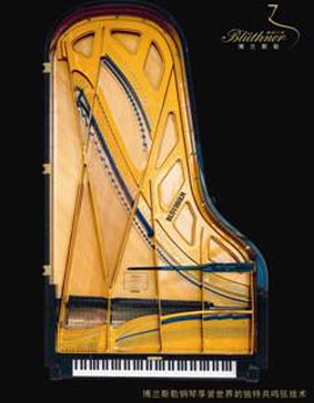 博蘭斯勒鋼琴最為出名的一個(gè)獨(dú)特技術(shù)是“共鳴弦”技術(shù),這 個(gè)一技術(shù)是在高音區(qū)的每一個(gè)音(大約為最高的兩個(gè)八度)上使用 四根而非三根弦,多余的弦被抬高到稍稍高于其他弦而能夠不被弦 槌擊到的程度,這種效果則類似于雙音階,幾根弦產(chǎn)生共振,為高 音帶來(lái)更多的亮度色彩,不過四根弦要統(tǒng)一調(diào)校,不能高一個(gè)泛音 。在過去,共鳴弦是在復(fù)雜的搭扣系統(tǒng)和特殊琴橋構(gòu)造的基礎(chǔ)上實(shí) 現(xiàn)的。公司稱共鳴弦的效果多數(shù)會(huì)在重?fù)粝虏怕牭玫剑谳p柔的 演奏中是不會(huì)顯現(xiàn)的。博蘭斯勒還使用了其他一些不平常的特性。 如音板在高音琴橋下方最大限度的使用了音板頂,而非通常下的弧 形響板頂。人們認(rèn)為這樣可以在最大壓力下提供最佳支撐力,并能 協(xié)助聲音傳輸和減少音板頂變形。