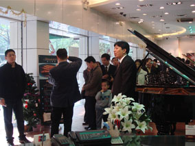 下午14時(shí),在博蘭斯勒中國(guó)公司市場(chǎng)人員的帶領(lǐng)下,全體經(jīng) 銷(xiāo)商一同參觀了位于廣州市環(huán)市東路上的博蘭斯勒標(biāo)準(zhǔn)4S展示專(zhuān) 賣(mài)店,專(zhuān)賣(mài)店囊括了博蘭斯勒旗下的四大品牌:博蘭斯勒、海斯勒 、歐米勒、塞勒;為紀(jì)念博蘭斯勒創(chuàng)始人JULIUS BLUTHNER特 制的JUBILEE鋼板的Model 6紀(jì)念版三角鋼琴是最受矚目的,可 謂是吸引了無(wú)數(shù)的“照相機(jī)”。從它精美的譜架的雕刻再到它美倫 美幻的鋼板的手工技術(shù)真是無(wú)不讓人贊嘆。