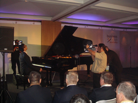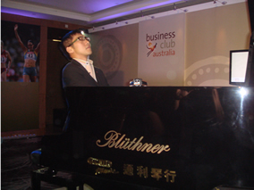 剪彩儀式后,特別邀請世界殿堂級鋼琴家趙胤胤使用德國國寶 -博蘭斯勒鋼琴為澳大利亞總理及二百多位嘉賓現(xiàn)場演奏《藍(lán)色狂 想曲》。商務(wù)俱樂部中央廳里,趙胤胤熟練自如的雙手在黑白鍵上 翻飛跳躍,一串串悅耳動聽的音符從指尖流出。飽含深情的演奏, 若抑若揚(yáng)的琴音,使彈者神迷,聽者忘心。陸克文總理完全沉醉在 藍(lán)色狂想的音樂世界中,也完全被博蘭斯勒那飽滿、圓潤、極富穿 透力的黃金音色所折服。一曲終了,陸克文總理激動地用地道、流 利的漢語贊賞趙胤胤的精彩演奏,并高度贊揚(yáng)博蘭斯勒鋼琴不愧為 德國國寶。