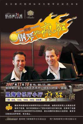 德國著名鋼琴藝術家、當今世界鋼琴界的當紅明星——歐米勒 孖寶即將“駕臨”廣州。11月10日,歐米勒孖寶“鋼琴也瘋狂 ”——歐米勒孖寶與劉詩昆藝術中心師生們友“琴”鏈接音樂會將 在星海音樂廳舉行。作為世界鋼琴界當前最炙手可熱的人物,歐米 勒孖寶擅長以非傳統(tǒng)的方式進行鋼琴演奏,網(wǎng)球、拳頭、肘甚至臀 部都是他們演奏的工具,他們的魅力早已席卷歐美。這次廣州巡演 ,主辦方特邀劉詩昆藝術中心的師生們與歐米勒孖寶進行一場音樂 聯(lián)歡,屆時,不僅有鋼琴表演,還有舞蹈、小提琴、模特秀等精彩 演出。毫無疑問,這將是一場令人期待的音樂狂歡秀。
