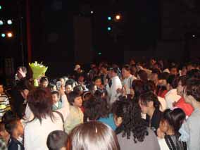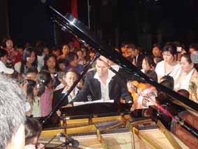 當(dāng)晚演出行至終場(chǎng)時(shí),“歐米勒孖寶”退至幕后。精彩的演出 令在場(chǎng)觀眾尤為留戀,他們極力拍手、瘋狂呼喊“孖寶、孖寶”。 當(dāng)“歐米勒孖寶”重返舞臺(tái)時(shí),在場(chǎng)觀眾再也按耐不住內(nèi)心的欣喜 之情,紛紛涌上舞臺(tái),欲將“歐米勒孖寶”久久的留在舞臺(tái),共享 音樂之美?!皻W米勒孖寶”為全場(chǎng)觀眾的喜悅為感動(dòng),于是,舞臺(tái) 上人山人海,觀眾們互相簇?fù)碇?,鮮花與掌聲將“歐米勒孖寶”環(huán) 抱著,“歐米勒孖寶”在這個(gè)特殊“舞臺(tái)”上為觀眾們?cè)俅潍I(xiàn)上精 彩表演,現(xiàn)場(chǎng)觀眾們的喝彩聲、現(xiàn)場(chǎng)相機(jī)鏡頭搶拍聲不絕于耳。 歐米勒孖寶 2008 鋼琴也瘋狂中國巡演