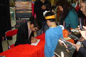 隨后,趙胤胤接受廣州媒體的采訪,他向媒體和觀眾介紹了他 新專輯的曲目、風(fēng)格,并現(xiàn)場(chǎng)接受媒體和聽(tīng)眾的提問(wèn),趙胤胤幽默 機(jī)智地回答引來(lái)陣陣歡笑,之后又為觀眾獻(xiàn)上了一曲格什溫的《藍(lán) 色狂想曲》,這曲融爵士樂(lè)和交響樂(lè)風(fēng)格于一體的曲子將現(xiàn)場(chǎng)氣氛 帶到了高潮。最后,現(xiàn)場(chǎng)簽售專輯正式開(kāi)始,樂(lè)迷們?cè)缫云炔患按?的排起了長(zhǎng)長(zhǎng)的隊(duì)伍,場(chǎng)面熱烈而有序。為了慶祝本次活動(dòng)的圓滿 成功,博蘭斯勒鋼琴中國(guó)公司為趙胤胤送上鮮花以表祝賀。