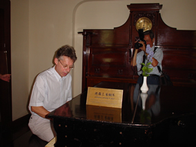 德國駐華使館文化參贊馮 · 馬丁也是一位鋼琴愛好者,看到 產(chǎn)于自己國家威廉時代的古鋼琴,喜悅之情溢于言表。索性坐到鋼 琴前找一找彈奏這國寶級古鋼琴 的感覺。